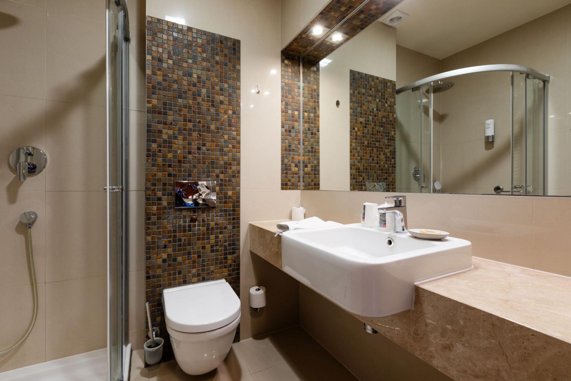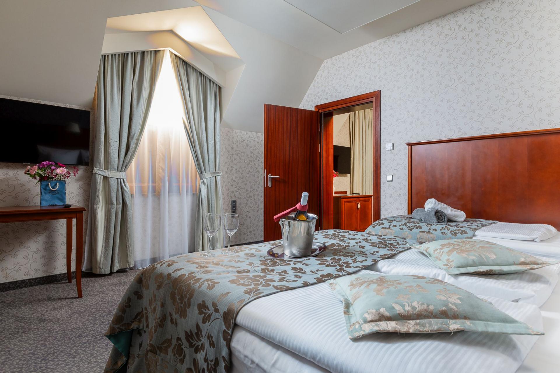 SUITE: big living-room and bedroom. High standard, well equipped rooms - only for non-smokers. Equipment: TV LCD + SAT, telephone, Internet connection, minibar, safe, hair-dryer, iron (on request). The price includes: breakfast, using SPA: swimming pool, jacuzzi, steam bath, dry sauna/sanarium, shower of sensation, playroom for kids, parking, VAT tax.